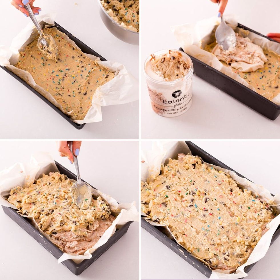 To assemble your sandwiches, line a 6 x 9-inch baking pan with parchment paper. Spread half of the cookie dough evenly on the pan. Spread a thick, even layer of Talenti Chocolate Chip Cookie Dough Gelato over the cookie dough layer. Place in the freezer for at least an hour to set. Spread the remaining cookie dough over the gelato layer and place in the freezer overnight to full set.