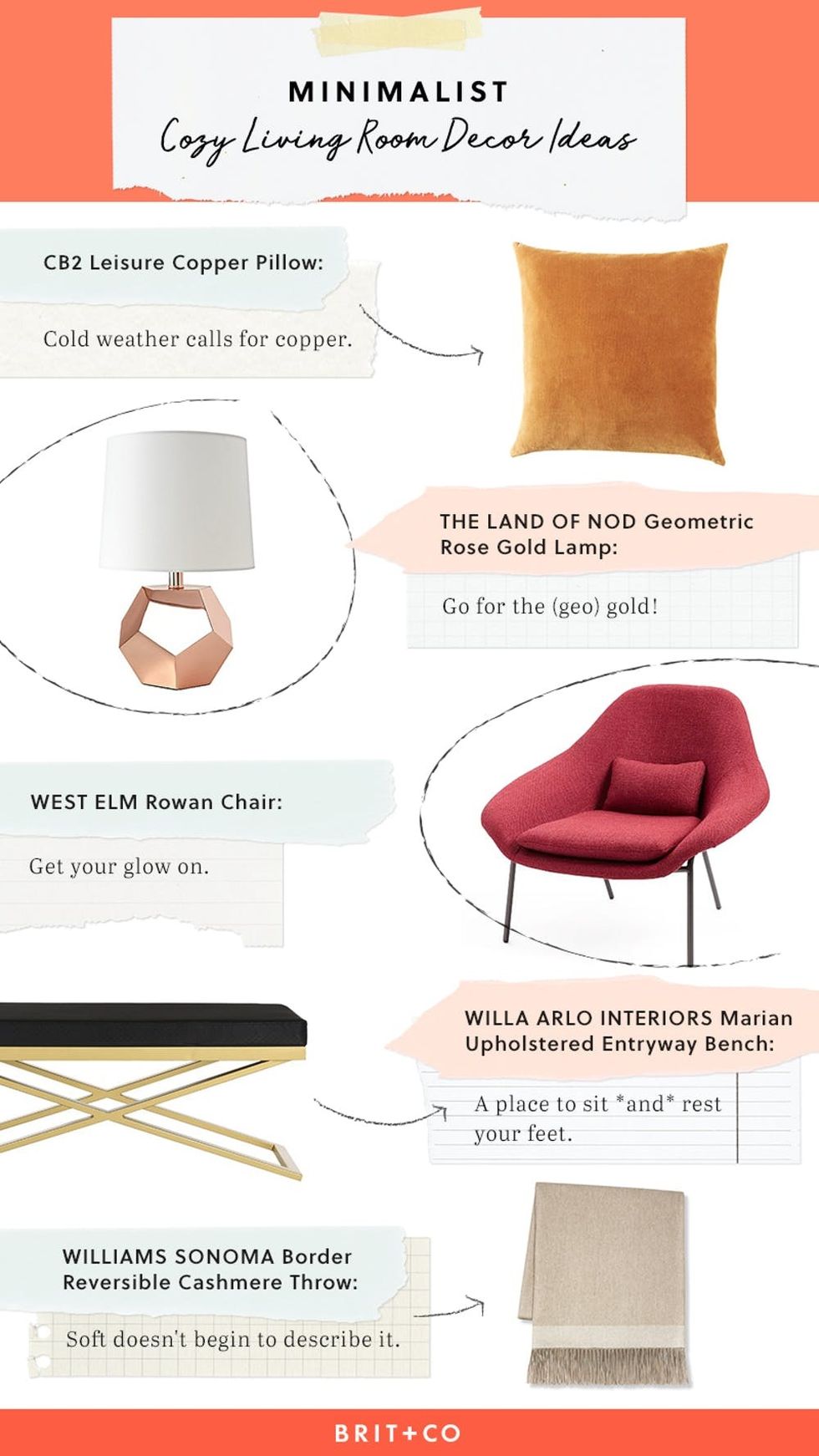 CB2 Leisure Copper Pillow ($40), The Land of Nod Geometric Rose Gold Lamp ($99), West Elm Rowan Chair ($350), Willa Arlo Interiors Marian Upholstered Entryway Bench ($230), Williams Sonoma Border Reversible Cashmere Throw ($300)