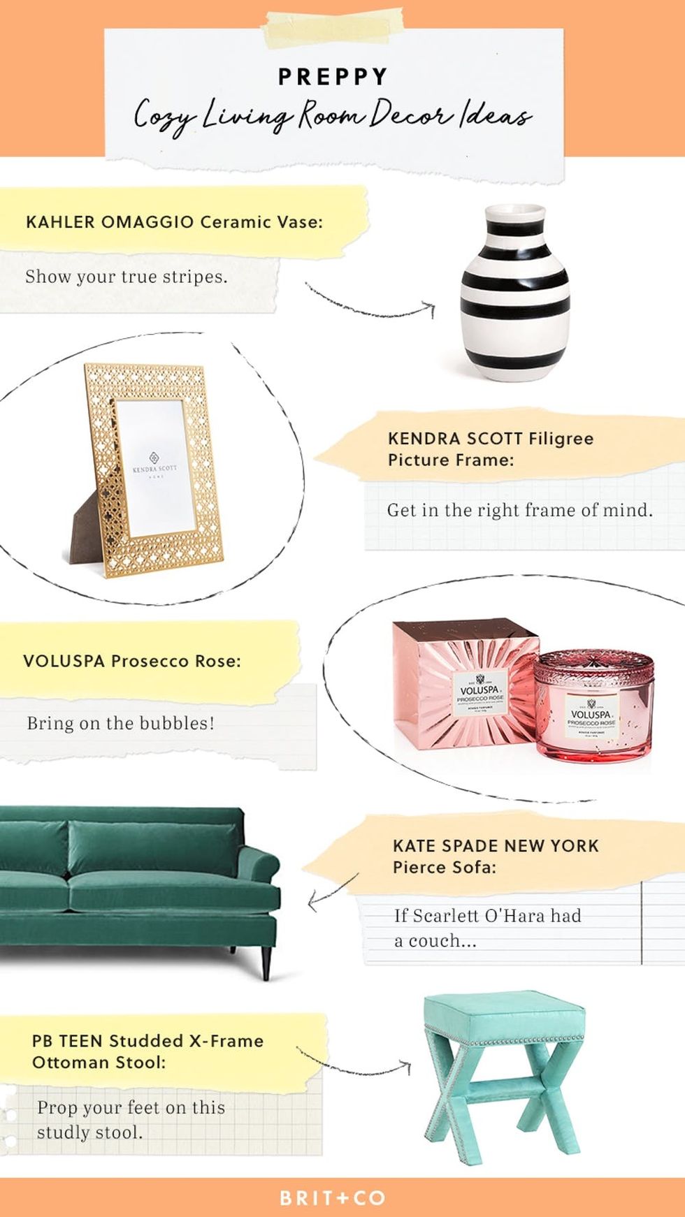 Kahler Omaggio Ceramic Vase ($30), Kendra Scott Filigree Picture Frame ($75), Voluspa Prosecco Rose ($30), Kate Spade New York Pierce Sofa ($4,040), Jonathan Adler Alpaca Throw ($219), PB Teen Studded X-Frame Ottoman Stool ($199)