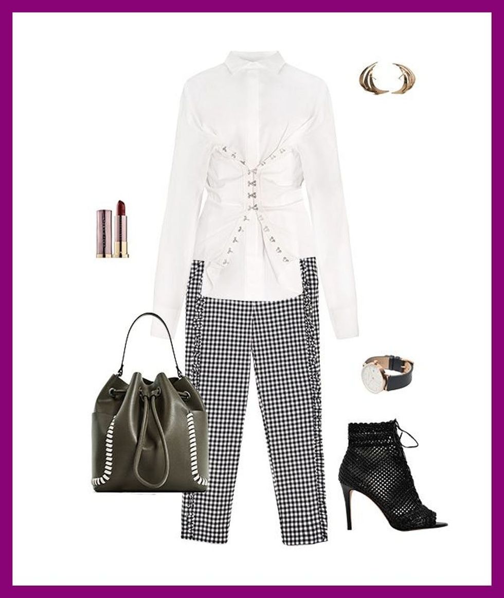 Gingham at work? It goes a little something like this. Ruffle-trimmed crop trousers decked out in the charming check print offer a solid base for your on-the-job style that’s both sweet and sophisticated. Paired with a corset-inspired button-down and don’t-mess stiletto booties, these pants get instantly upgraded to cool-girl status. Sculptural earrings and a dramatic berry lip further up the ante, while the addition of a classic timepiece — and potentially an oversized blazer — ensure your look doesn’t go in the direction of OTT.