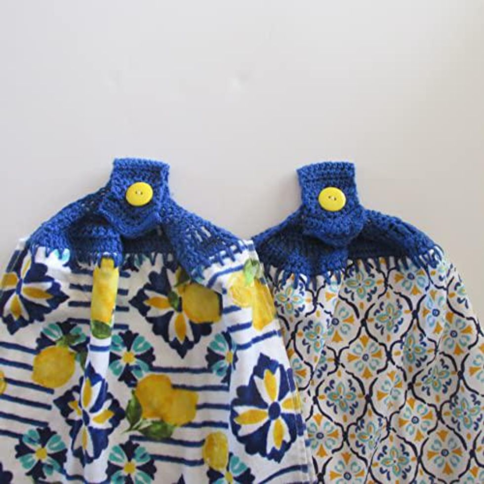 See it on AmazonA Set Of Hanging Kitchen Towels With Crochet Tops To Hang On The Refidgerator Handle