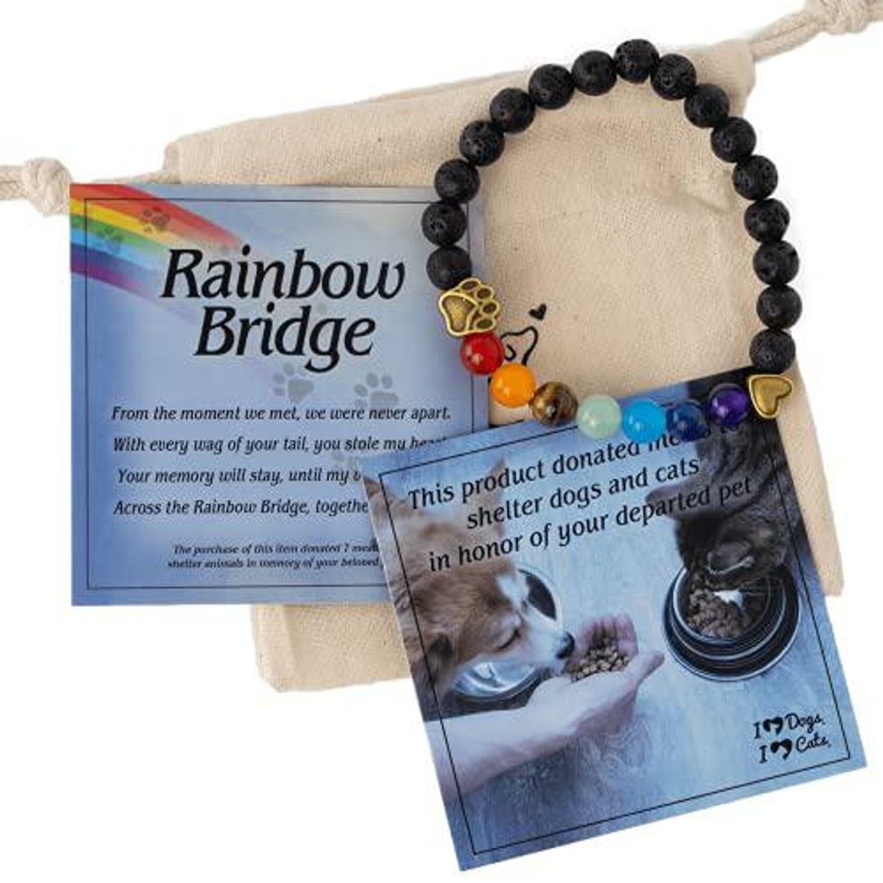 If you or a loved one has lost their pet recently, this Memorial Bracelet represents the rainbow bridge where pets wait for a reunion with their owners. With seven colored beads and one heart bead, which describes the journey of life you had together on earth and the piece of your heart, they took with them. The one paw bead represents your beloved pet waiting for you at the rainbow bridge, and the black lava beads symbolize the earth and our journey through this world with our furry friends.