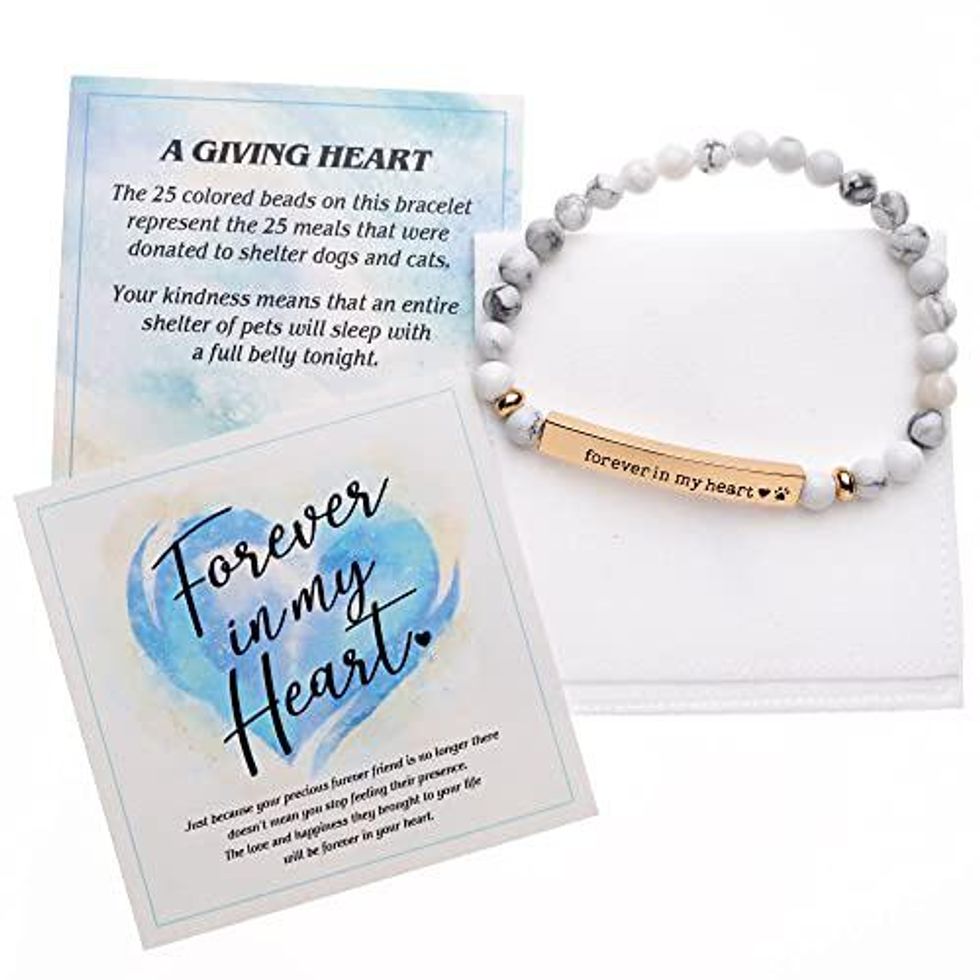 While your dog may no longer be by your side, the bond you shared will last forever, and this iHeartDogs Paws & Reflect Dog Memorial Bracelet will fill your heart every time you look down on it. This bracelet features white turquoise stones representing purity, unconditional love, and a sense of healing and peace. The words “Forever in My Heart” are centered on our pet memorial bracelet with a golden ring on each side. One ring symbolizes the love you have for your dog, and the other represents the love you have for rescuing shelter dogs because for every bracelet purchased, iHeart donates 25 meals to a shelter.