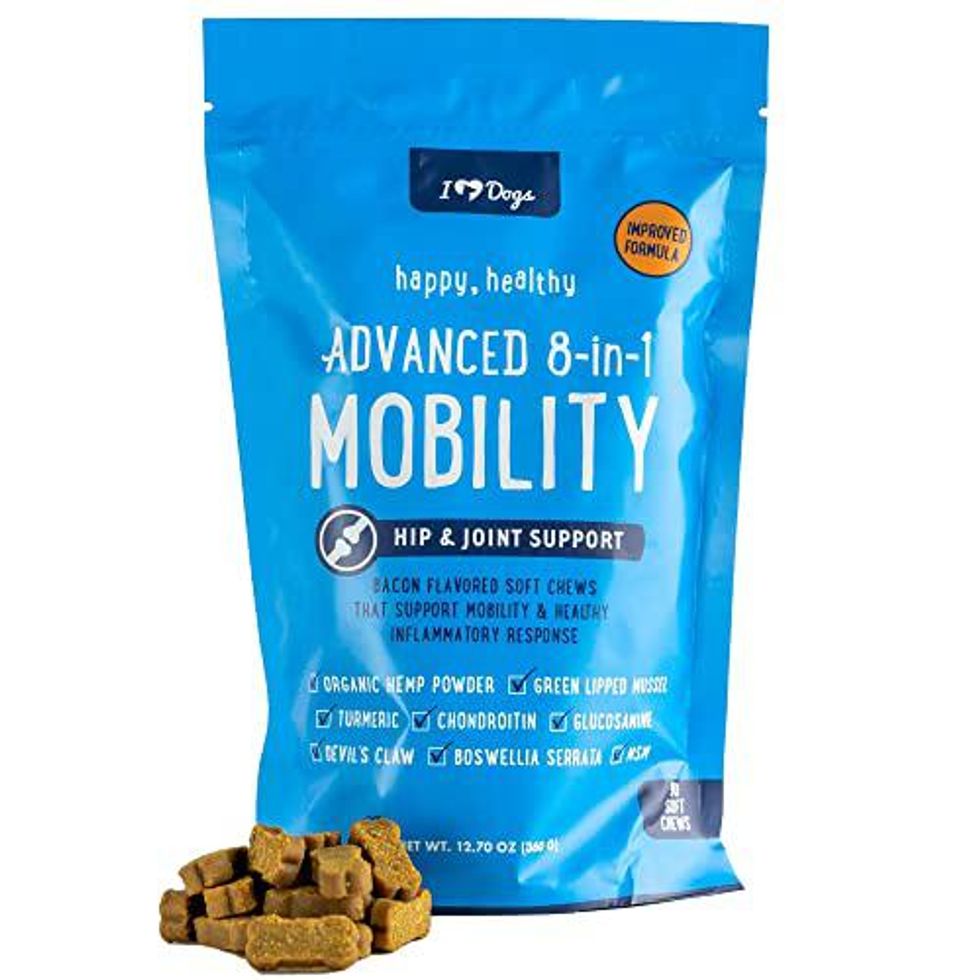 These bacon-flavored iHeartDogs Advanced 8-in-1 Mobility Chews have a unique blend of eight active ingredients to support your pup’s joint health and function. Packed with all-natural ingredients like organic turmeric with black pepper extract, vitamins C and E combined combat free radicals from causing painful inflammation and reduce joint distress to keep your pup happy and healthy.