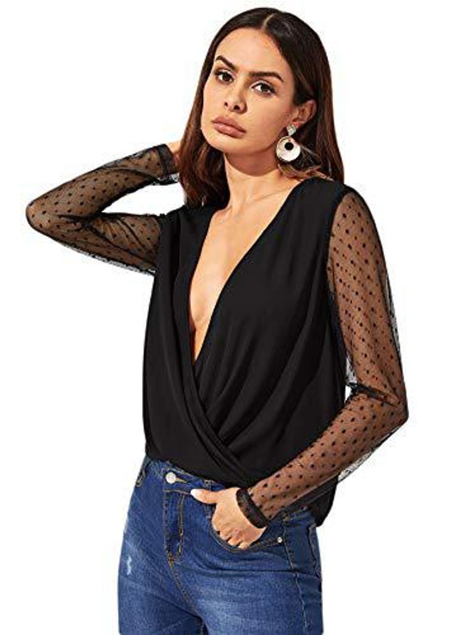 If you are going for the classy, yet sexy Valentine's Day look this year, I have found the hottest choice for you! This deep V-neck blouse has the most attractive draped neck that will show off some skin while leaving your body looking flawless. If that's not enough, this blouse has adorable sheer sleeves with polkadot accents to create a chic and fashionable look for both you and your date to enjoy.
