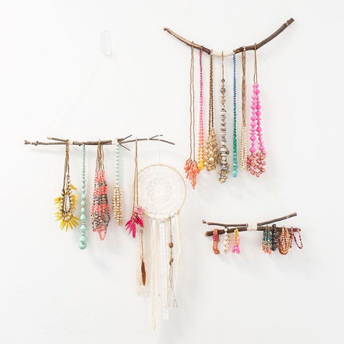Displaying and organizing jewelry doesn’t have to be expensive. 31 Bits created this next decorative jewelry organizer out of simple materials like found branches and string.