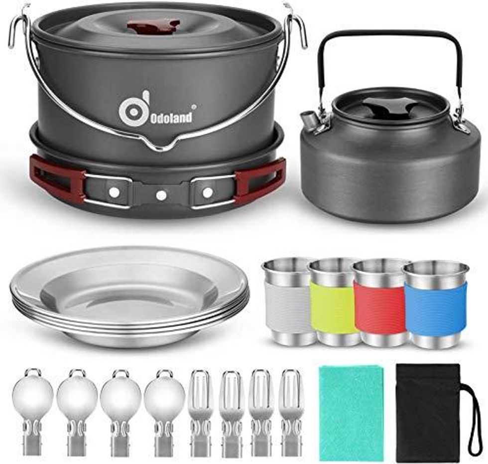 This campground cookware set comes with twenty two different pieces of cookware, but all the pieces get stored in a super compact way which makes it perfect for on the go use.