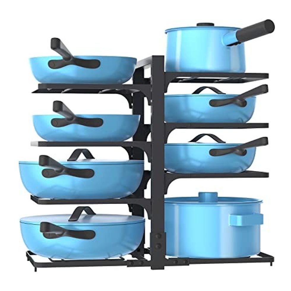 Put your pots and pans on the pan organizer for a functional kitchen space saver that will be sure to put a smile on your face. Organization and cleanliness is key to a great cook.