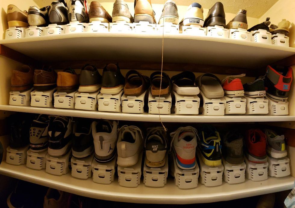 When I first saw this product, I had to rub my eyes and check again because this is genius! These are shoe organizers that allow you to stack your shoes on top of each other to save even more space. It is crazy the difference that a certain product can make when it comes to closet organization. You can now save space with up to 20 shoe organizers.