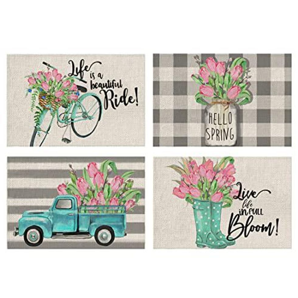 Take your table settings up a notch with some vibrant and flowery placemats. I love that the set comes with four different patterns. Rainboots, bikes, and tulips: it gives you the vibes of being outside while you're happily inside.