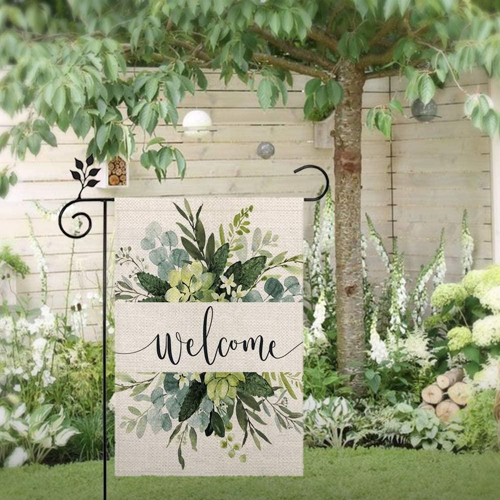 You don't need to keep your seasonal spirit to yourself! Share it with everyone in the form of a garden flag. This one welcomes visitors to your space with a background of soft greenery.