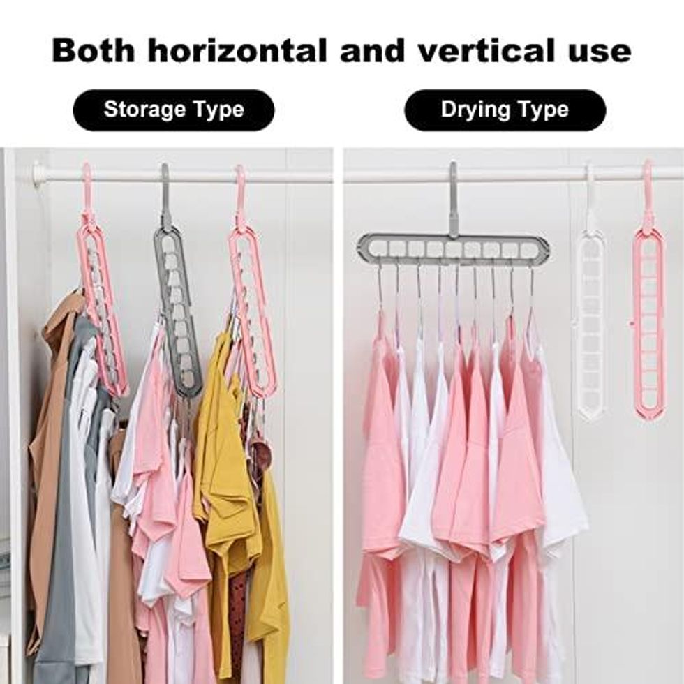 Each Closet Organizer Hanger has 9 big holes to easily hang clothing from. The thick hook is designed to be durable and load-bearing. I like the 360° Rotatable Hook since I like all my clothes to face the same way. The set includes 6 multi-colored Hangers.