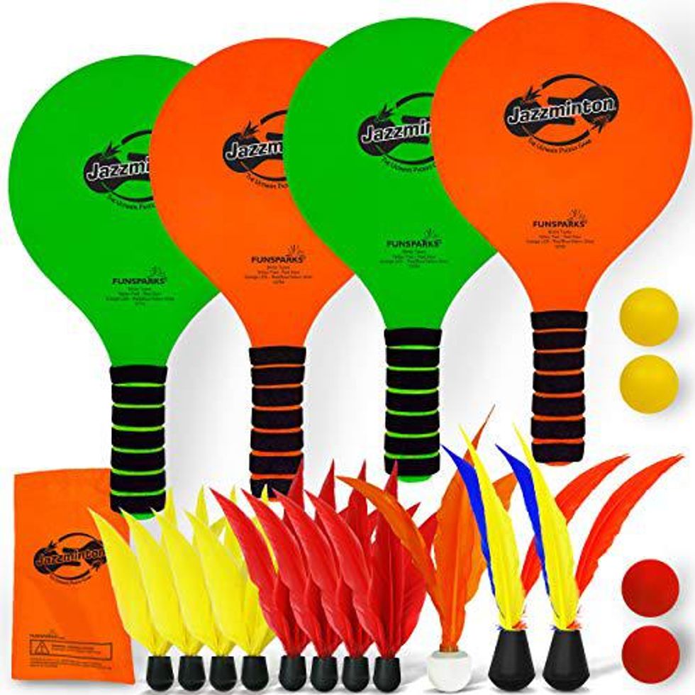 Jazzminton "combines the best of badminton and ping pong into one extremely fun all-season paddle game." The set includes 4 paddles, 11 birdies of different types, and 4 balls, all in a convenient carry case. One of the birdies is LED so you can continue the game after dark.