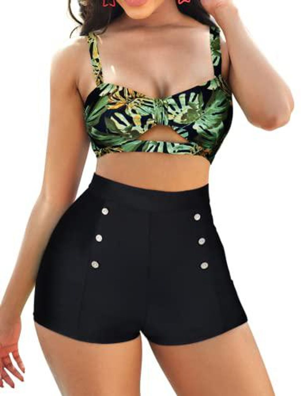 I love the nostalgic look of the decorative buttons on the high-waisted boy shorts of this Two Piece Bathing Suit! The shorts provide full coverage and tummy control that will be flattering on any body shape. The Bikini Top has a sexy cutout under the bust. The shoulder straps are adjustable, and the top has removable padding. Available in 24 bold patterns.