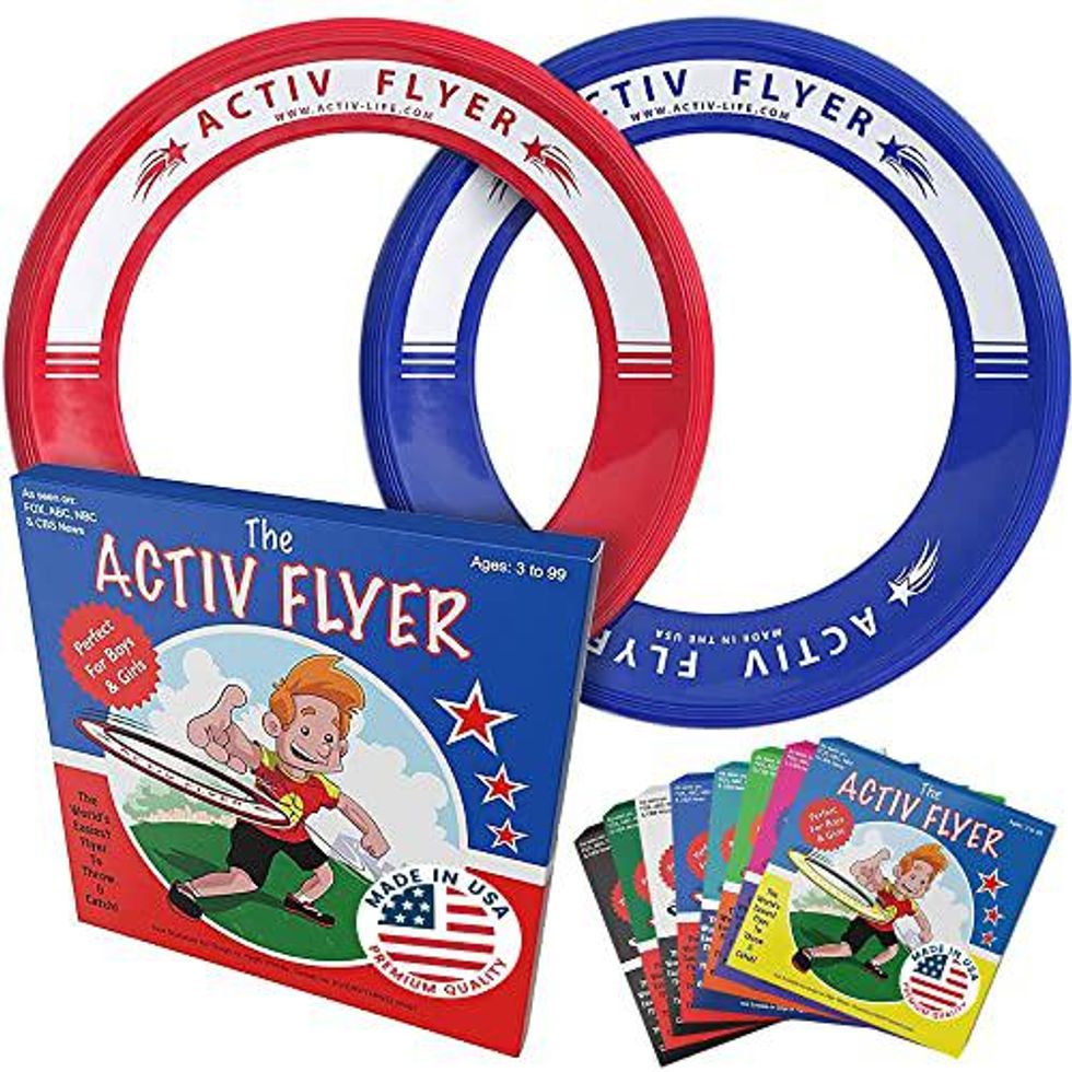 The Activ Flyer is perfect for kids since it is 80% lighter than standard frisbees. It's safe and comfortable to catch. The Activ Flyer is engineered to fly straight every time and can soar up to 80 feet in calm weather. The fact that it floats on the water makes it great for the beach. It's been featured on ABC, CBS, and NBC TV and is made in the USA.