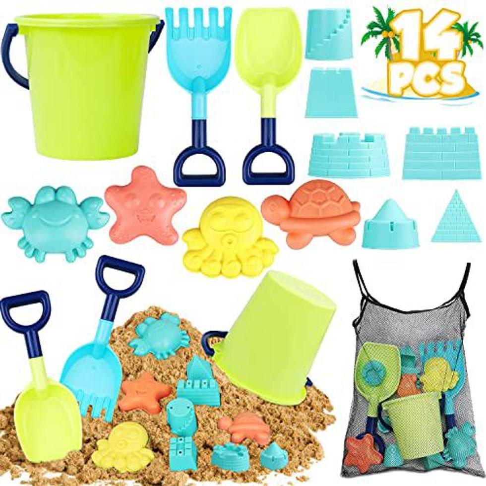 No trip to the beach would be complete without taking a Bucket and Shovel. TOY Life's Beach Sand Toys Set is more than that. The 14 Piece Set comes with a bucket and 10 fun molds to create sandcastles and some animal friends. The rake and shovel are durable digging tools. There is also a mesh bag to carry it all in.