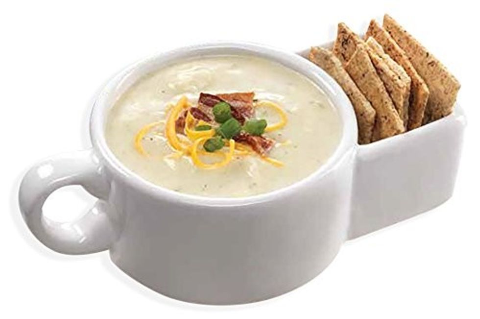 If you like your soup and crackers, then you will love this setup. The soup and cracker mug come together, giving a side compartment to make a serving quite fun. Could also be a great way to serve veggies and dips.