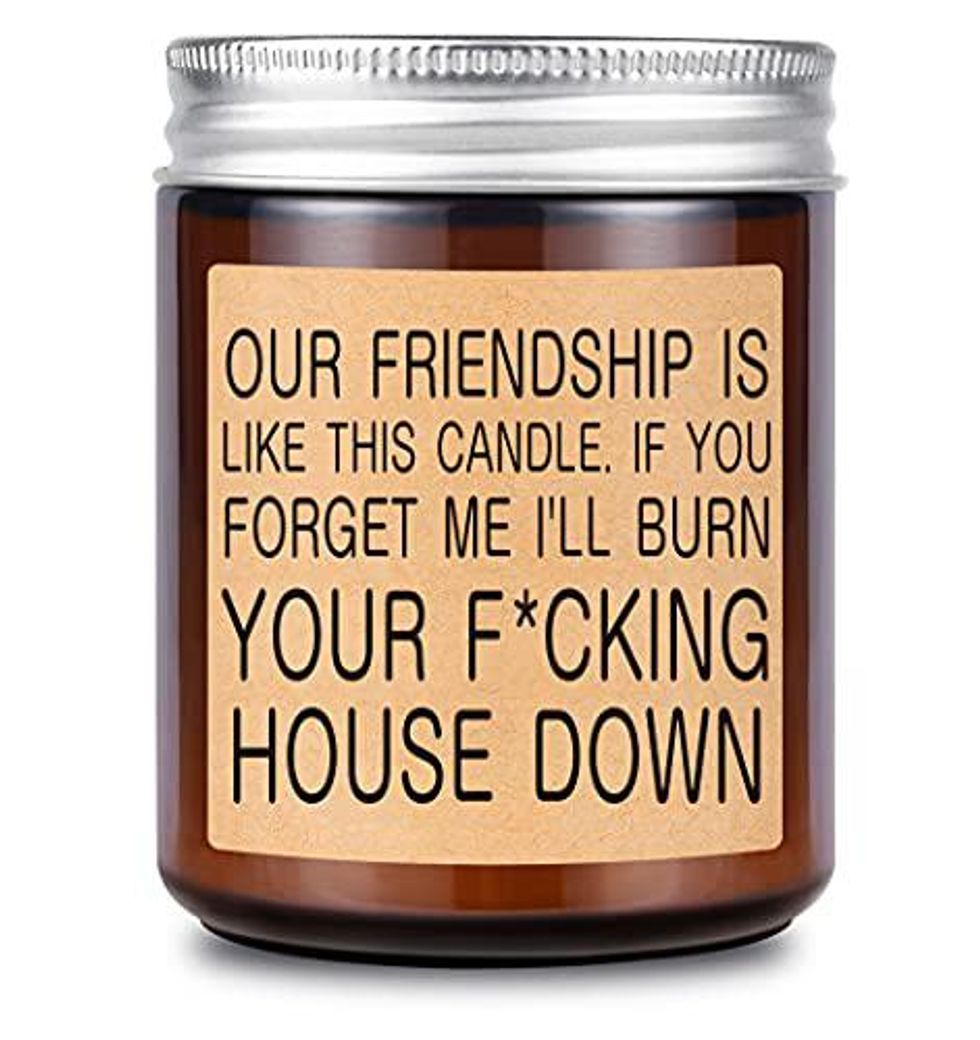 If you have a best friend that you simply can't live without, this Lavender Scented Candle is the gift for them. A sweet smell with an even sweeter message, this candle reminds your bestie that "Our friendship is like this candle. If you forget me, I'll burn your ******* house down." This makes a great going-away present.