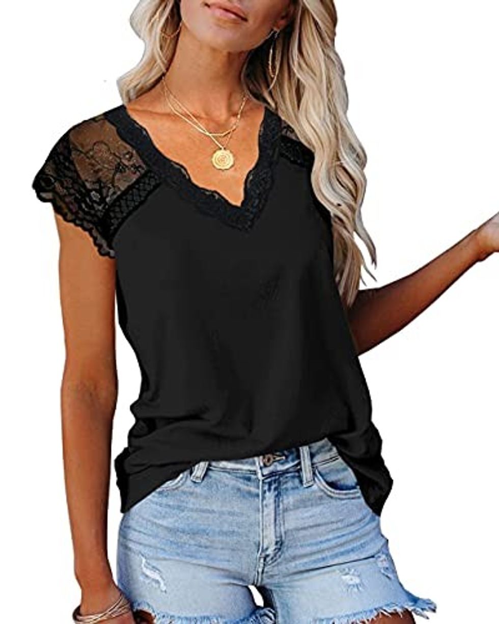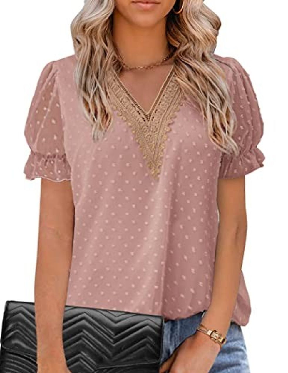 Swiss dots are a pattern that is feminine, graceful, and elegant, which makes them feel just right for spring. Get the look in the form of this lace neckline shirt that comes in some sweet pastels.