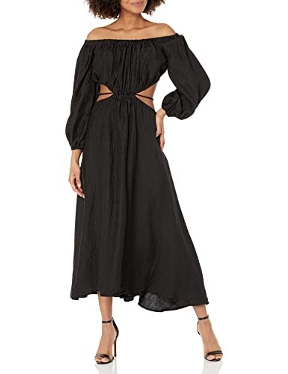 It's finally warm enough to show skin, and the best way to do it is with a dress that features cut outs. This off the shoulder number has bold cut outs along the side that you'll love.