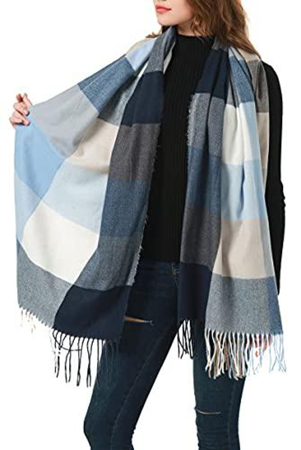 This women's cashmere feel blanket shawl is the perfect item to own in the transitional weather period as you can just throw it on top of everything. I love the multi colour plaid design in blue!