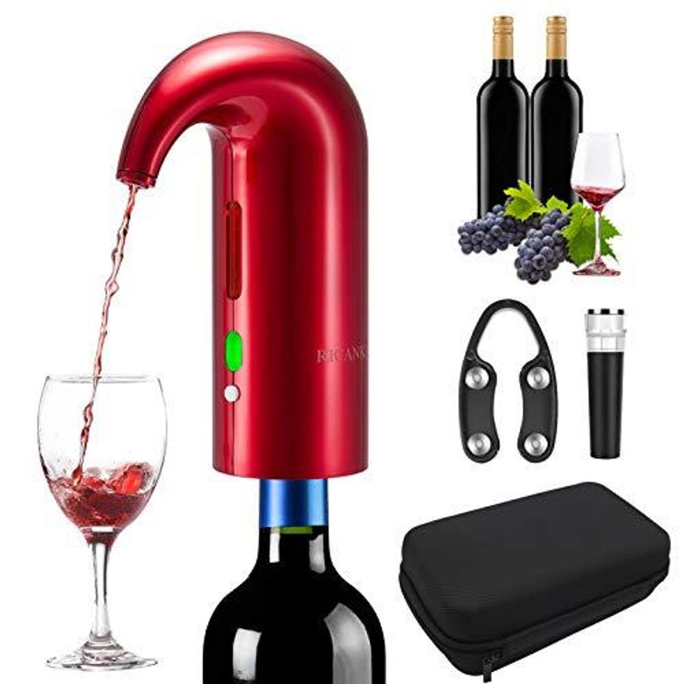 Save yourself from feeling icky after reacting with sulfites in your wine. This RICANK Electric Wine Aerator Pourer is a portable device that enhances the taste and aroma of your wine. It uses a one-touch operation and multi-smart automatic wine oxidization technology to dispense and aerate wine, resulting in a smoother and more flavorful taste. This wine dispenser pump is USB rechargeable and can be used for red and white wine.