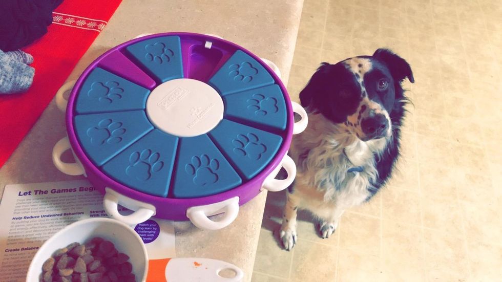 Stimulate your dog's brain function while you're away during the day with this fun and easy treat game for your dog. It is considered level 2 out of 5 by canine professionals; they're sure the dog can figure it out.