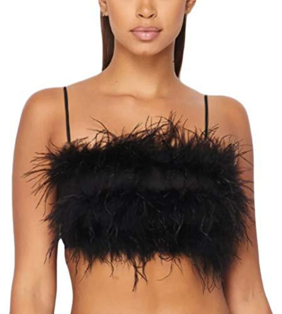 One thing we've been seeing absolutely everywhere for summer 2022 is feathers. You can take that style and go even further by combining it with the current tube top trend in this feathered top.