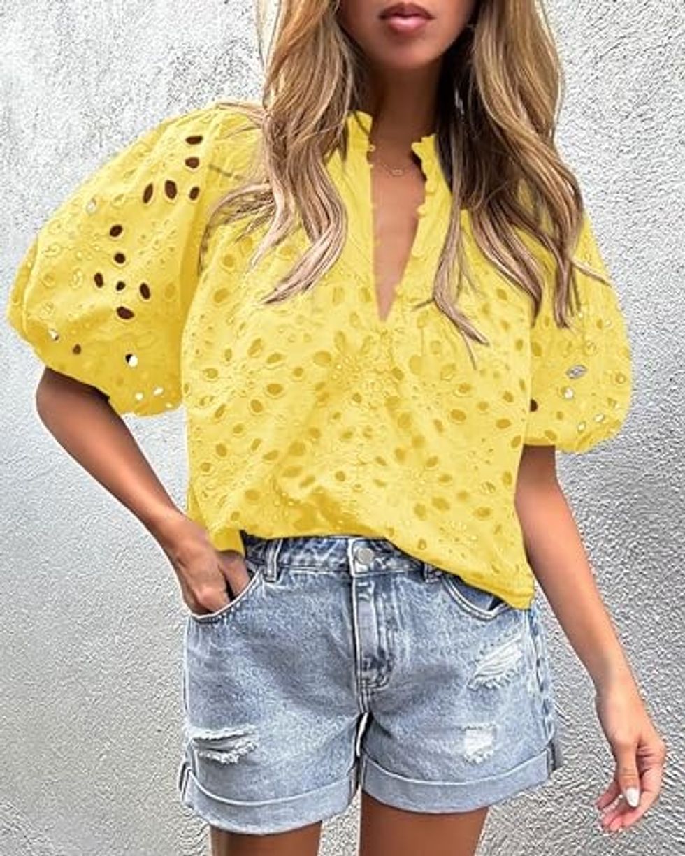 Step up your style game with yellow eyelet top. Featuring intricate lace embroidery, button accents, and a flattering V-neck, this top adds a touch of elegance to any outfit. Perfect for any occasion, it's sure to turn heads wherever you go.