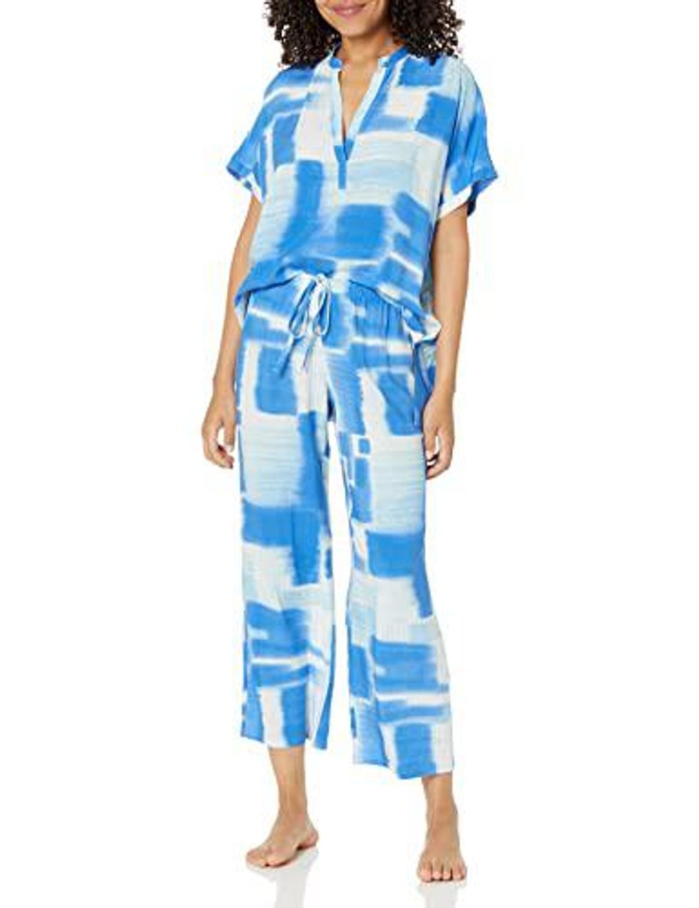 If I was asked to describe the perfect loungewear Pajamas, these would be it! The pants are pull-on with a drawstring waist and comfortable wide legs. The short sleeve top has a split V-neckline and side slits. As if that wasn't enough, they are so pretty! The blue and white Kasuri printed fabric creates a tranquil vibe. X-Small to X-Large.