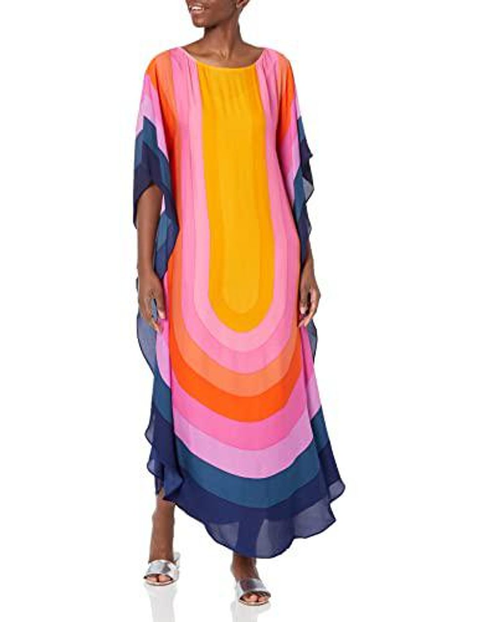 This is a new arrival, and Amazon is already selling out of this joyful and brightly colored Caftan. At the time of this writing, select sizes are still available with "more on the way." It's no wonder the gorgeous Caftan is so popular, with the sunshine yellow center encircled in rainbow colors of pink, orange, and blue. 100% Viscose.