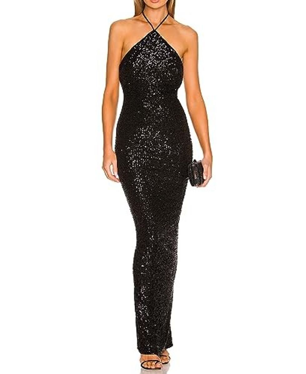 Elevate your New Year's Eve look with the sheer elegance of this Halter Neck Maxi Dress. This stunning dress is a showstopper, featuring an open back and a back slit. The halter neck design adds a touch of glamour and ensures a flattering silhouette. Pairing this dress with a trendy slicked-back bun or ponytail highlights the intricate details of the halter neckline and open back and adds a modern and chic element to your overall look.