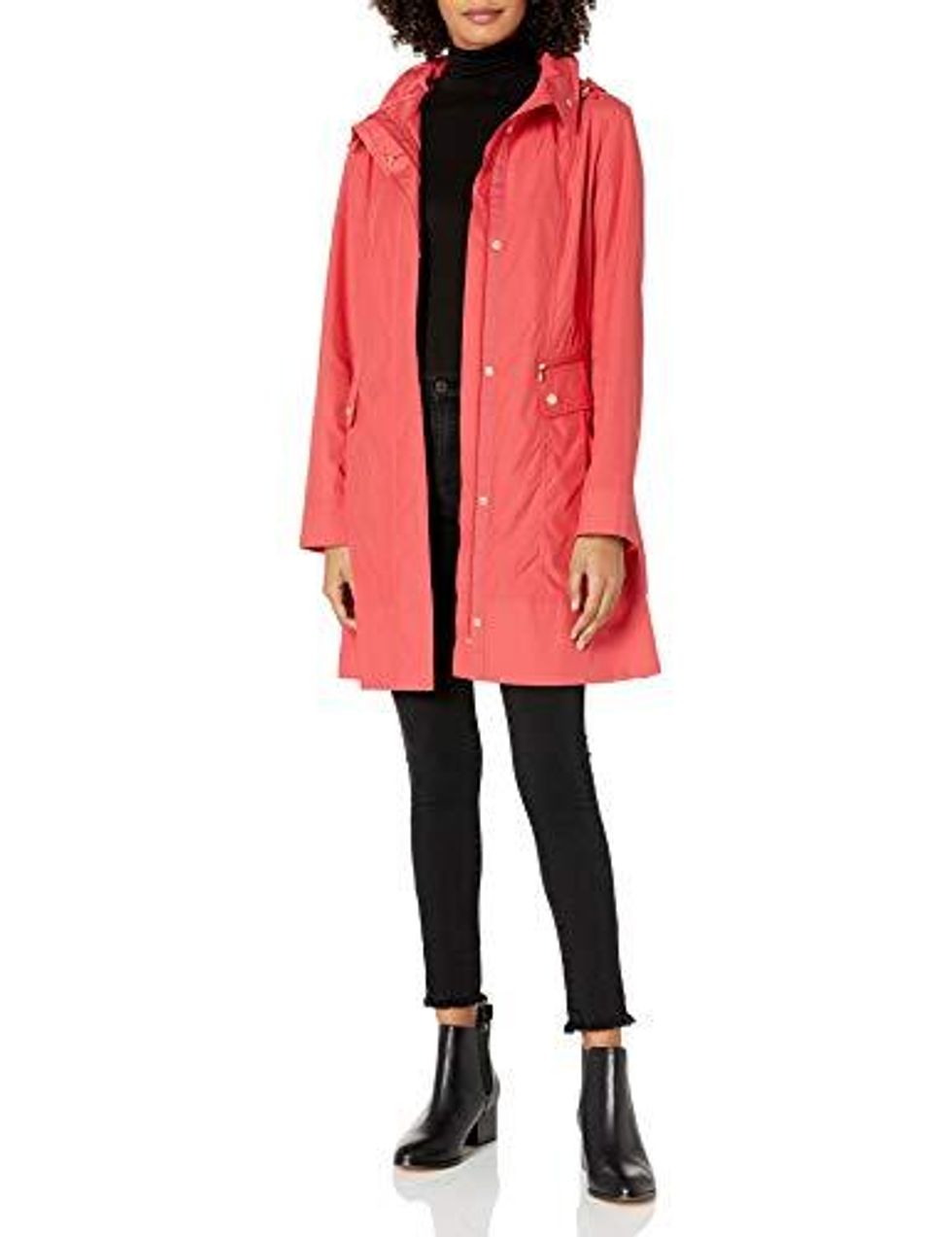 Cole Haan's Packable Hooded Rain Jacket folds into a cute little pouch that looks like a small purse. The hood is removable, and an adjustable back bow allows the waist to be cinched as desired. The Jacket comes in 15 colors and sizes ranging from XX-Small to 3X. Please refer to the size chart as a few reviews mentioned that the Jacket runs small and is narrow through the shoulders.