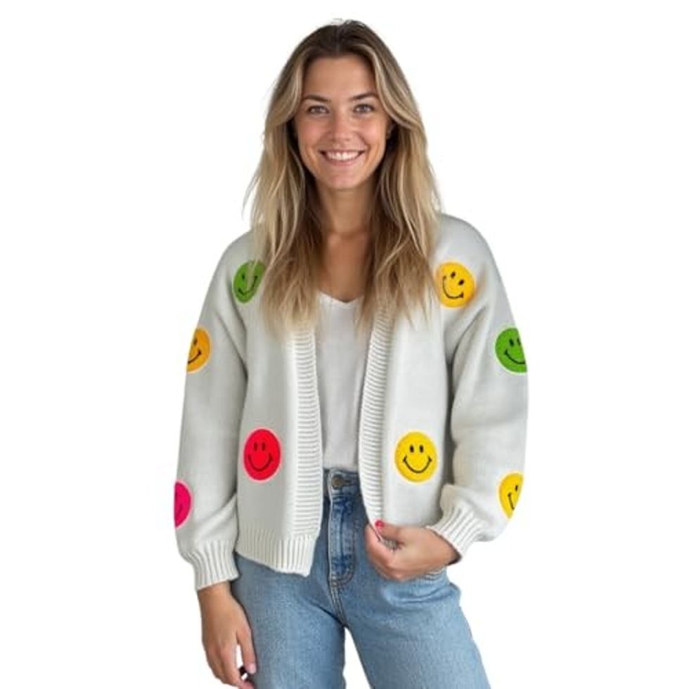 See it on AmazonBring Instant Joy With a Smiley Face Patch Cardigan