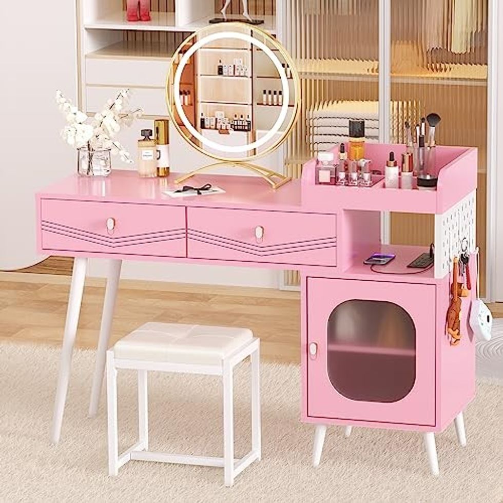 See it on AmazonGet Ready Like Barbie on this Cyclysio Vanity Desk with LED Lighted Mirror & Power Outlet