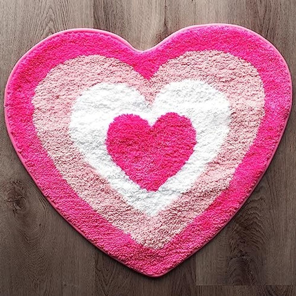 See it on AmazonThis Evovee Pink Heart Bath Mat Hot Pink Rug is Fun and Playful