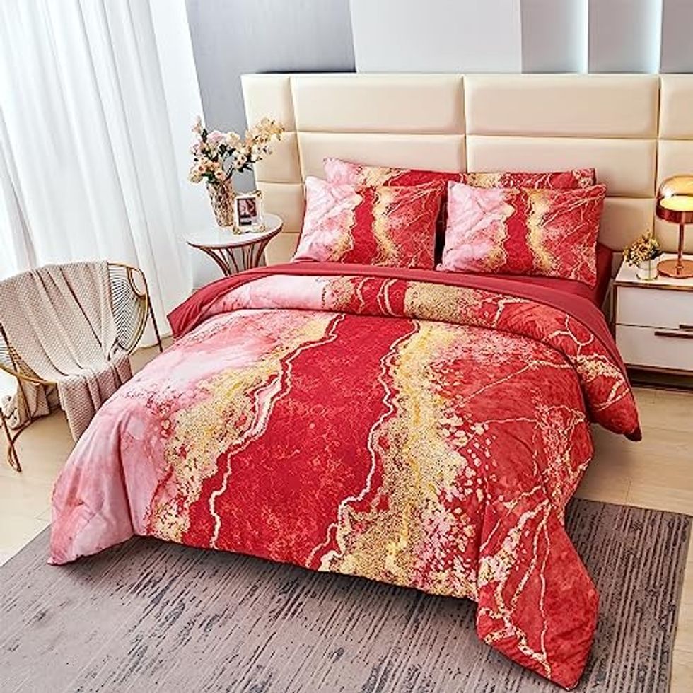 See it on AmazonSleep Soundly on this PERFEMET Queen Bed In A Bag 6 Pieces Pink Watercolor Marble Bedding Comforter Set
