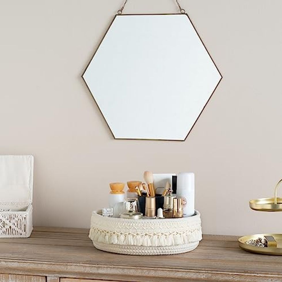 This woven organizer will help keep your belongings within perfect reach while maintaining a neat and tidy appearance. You can use it to hold things like makeup, cologne, towels, or even toilet paper to keep them front and center in a tidy way.