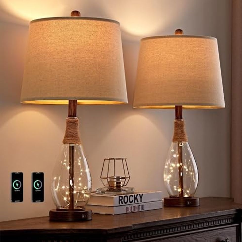 These glass table lamps will provide the perfect amount of warm lighting to any room in your home. They blend a farmhouse vibe with a boho touch and have fairy lights in the glass base for an enchanting ambiance. Plus, they include USB ports on the side for charging your phone.