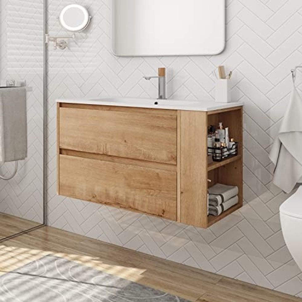 This bathroom vanity is perfect for providing discreet storage, both in the front and on the side. You get two drawers in the front that can easily slide out, and two side shelves to place some toiletries that you use every day. It has a glossy ceramic top and a rustic wood finish on the rest to give your home a minimalistic and modern look.