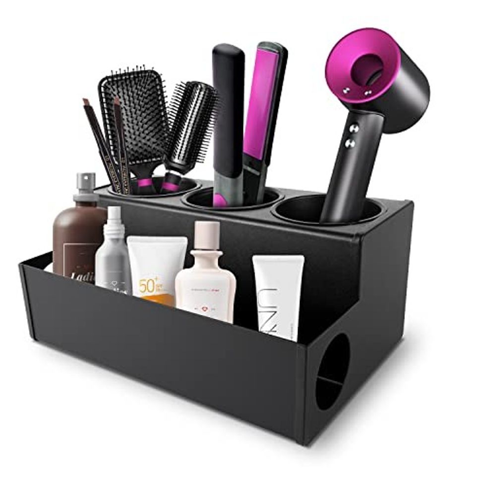 Finding space to accommodate all our different hair tools can be challenging, but this hair accessories organizer does it effortlessly. It's easy to place on top of your counter or in your cabinet. The top features three holders for items like a curling iron, blow dryer, straightener, or hair brushes, while an additional shelf holds your hair products. With its modern minimalist look, it adds to the organization of your bathroom or vanity.