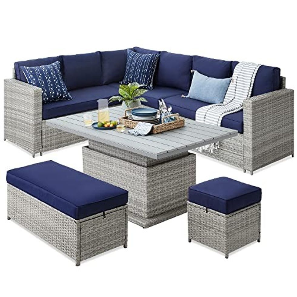 You'll wonder why you didn't create this nook sooner. Create a cozy outdoor lounge area with a six-piece wicker conversation set, which includes plush cushions and a stylish design, making it perfect for entertaining guests or relaxing with family.