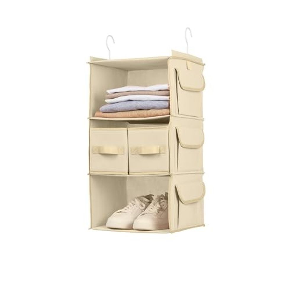 If you want extra space for folded clothes, shoes, and other accessories, take advantage of your closet space with this hanging shelf. It has three tiers, three side pockets, and two small pull-out drawers, giving you plenty of storage options, though there's also a six-tiered version available if you're looking for something with even more storage space.