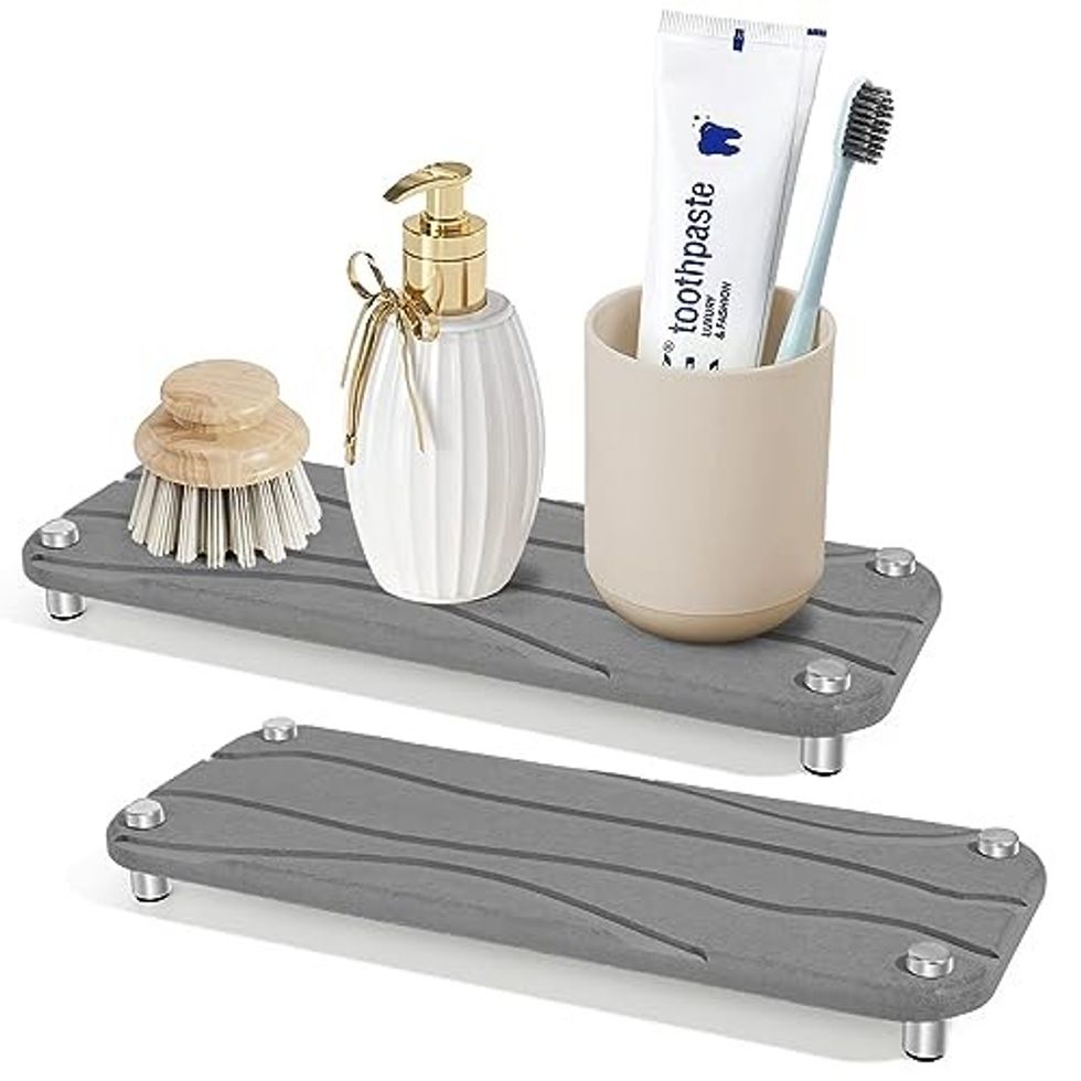 Perfect for organizing bathroom or kitchen sink accessories, these two stands are made of diatomaceous earth, which is not only very absorbent to keep counters clean and dry but also quick-drying. Plus, they have a minimalist design that adds a touch of modern charm to your setup, elevating both the aesthetics and neatness of your countertops.