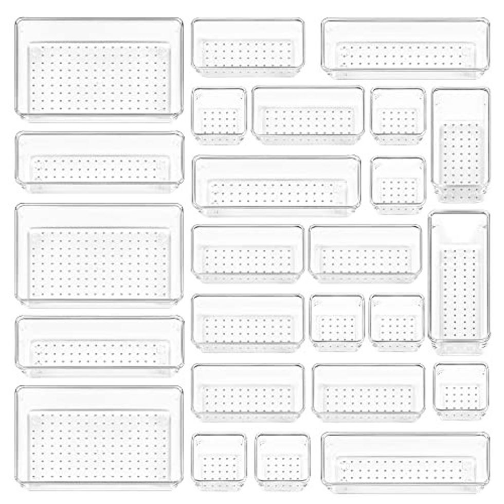 These trays come in four sizes that you can mix and match to get the perfect combination to fit your drawers. They can also be used on countertops and come with silicone pads you can stick on the bottom to keep them perfectly in place.