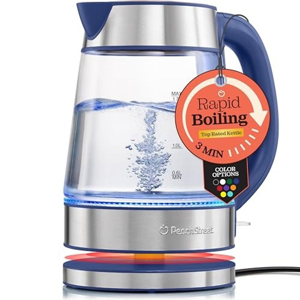 It only takes about three minutes for this electric kettle to get water boiling, making it great for whipping up tea, coffee, and more on busy mornings when you're rushing out the door. The borosilicate glass walls are designed to withstand sudden temperature changes. Plus, a blue LED light gives it a sleek look when sitting out on your counters.