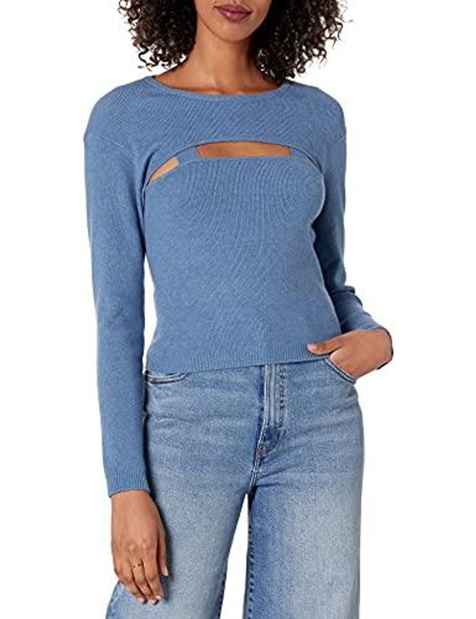 2022 featured a lot of two piece outfits, but a new version of the trend in 2023 is 2 piece sweater and shirt options. This mock neck sweater has a base and a bolero style top that creates the effect of a cut out.