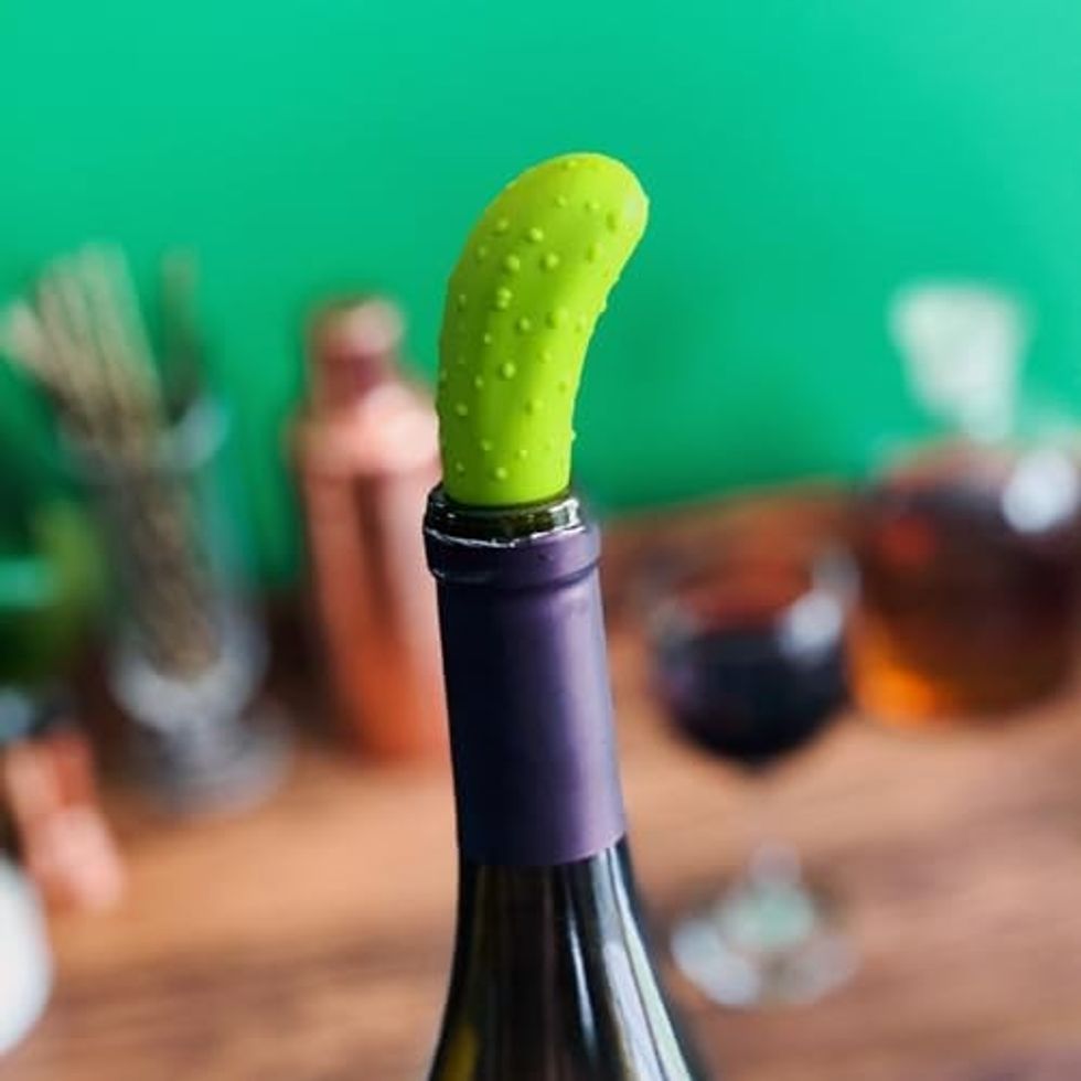 Keep your wine fresh with this pickle wine stopper. Standing 3.5 inches tall, this green pickle-shaped stopper is both fun and functional. It makes a great conversation piece and a quirky gift for wine lovers.