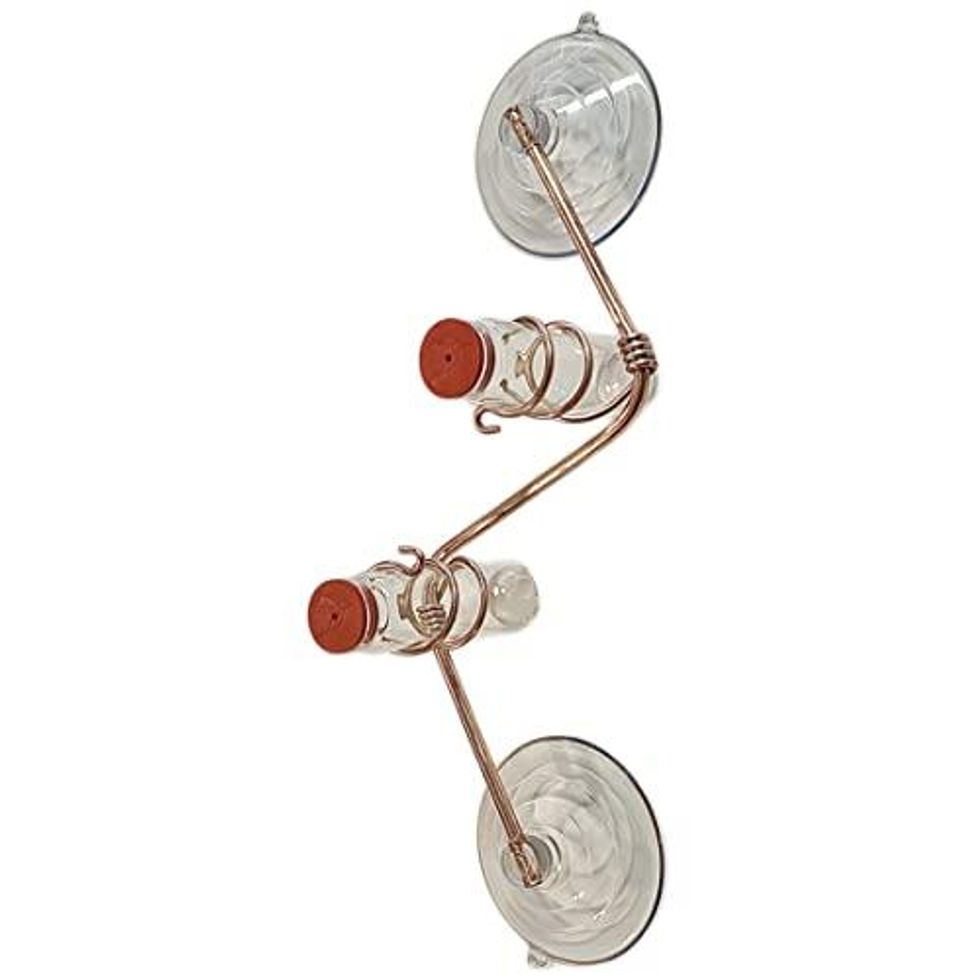 This modern and minimal Hummingbird Feeder has two glass bottles that are dishwasher-safe, for easy cleaning and refilling. Its copper frame is built to weather and last, and the large suction cups on the bottom help ensure that it stays securely fastened to your window. Nestle this cutie up in your home and enjoy as dozens of colorful fluttering birds come swooping through!