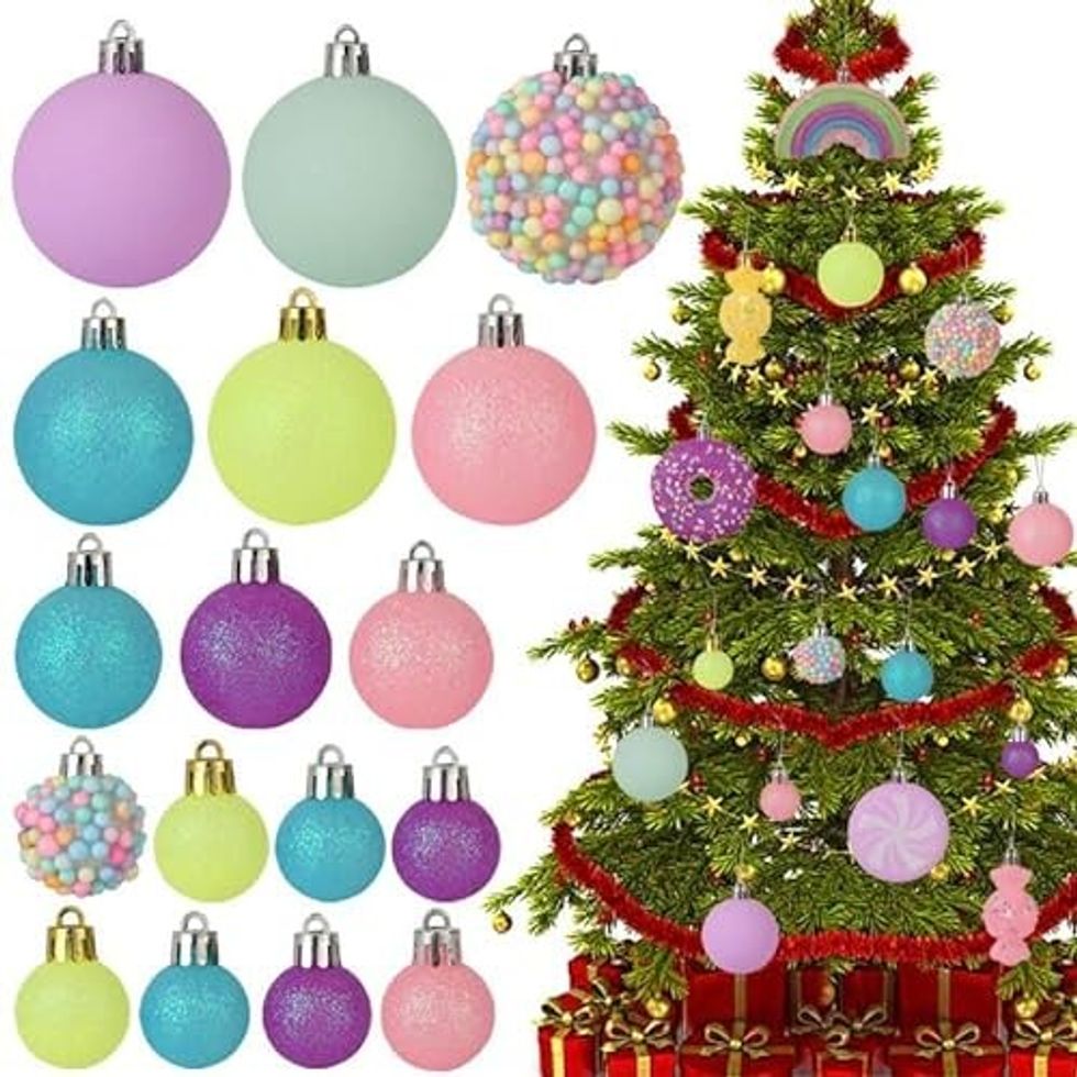 Pastel shades will bring a sweet touch to your Christmas decor. These ornaments have soft pink and purple hues as well as donuts and even rainbow shapes for ultra-sweetness and fun.